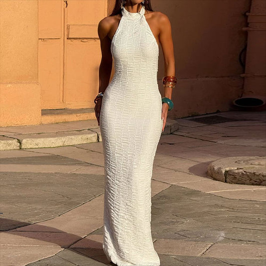 Solid Color Sleeveless V neck Halter Strap Backless Dress