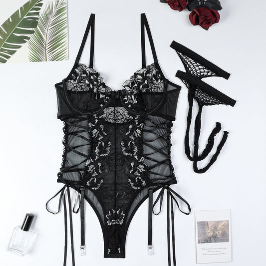 Embroidery Mesh Ultra-Thin with Steel Ring Breathable Bra Three-Piece Set