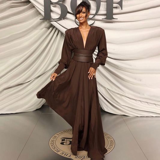 "V-Neck Long Sleeve High Waist Split French Party Dress"