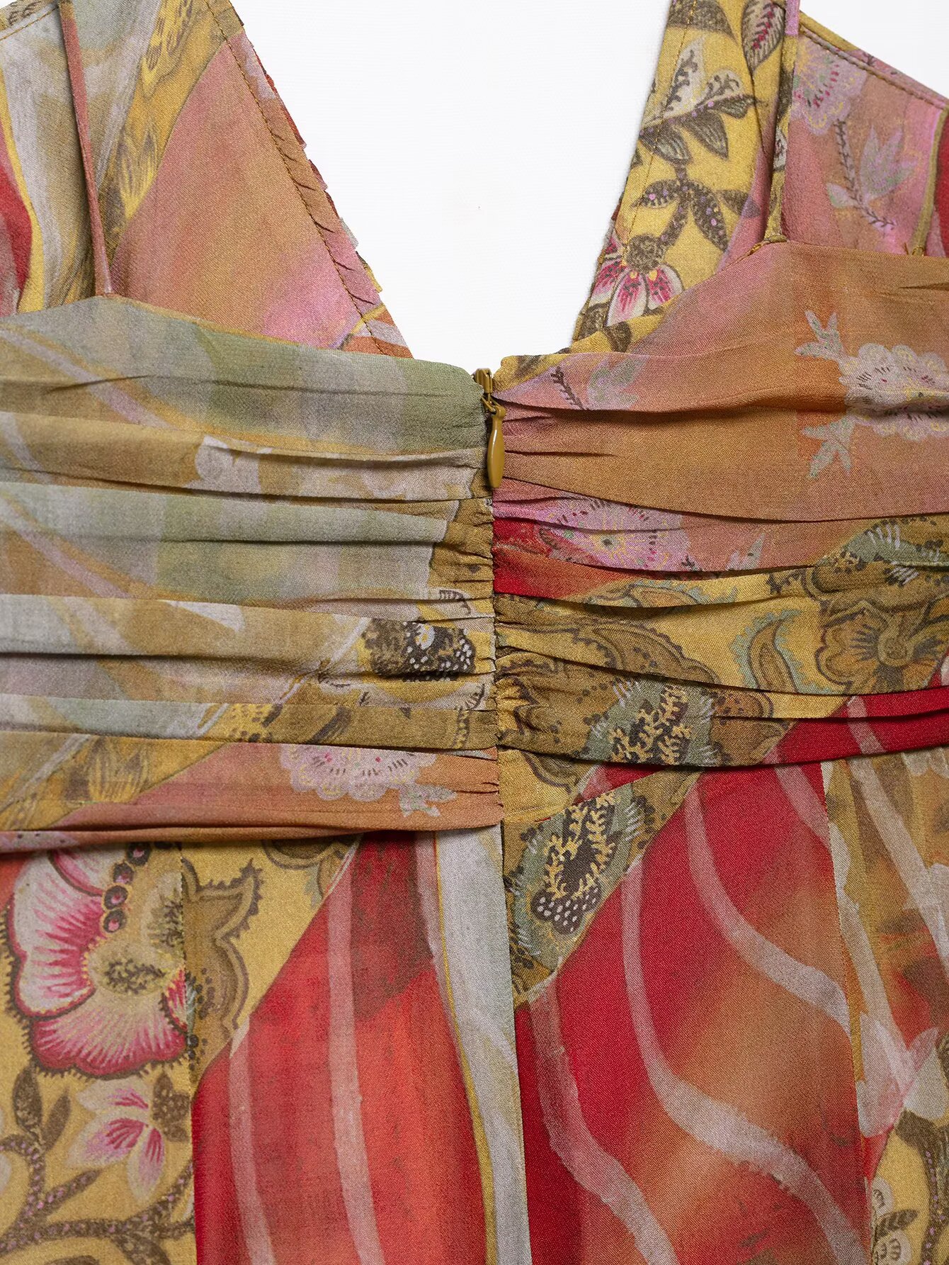 Embrace effortless summer style with our boho vacation maxi dress, crafted from lightweight polyester for breathable comfort. Featuring a slim fit silhouette, this A-line cami dress showcases a vibrant floral printed pattern, chic V-neckline, and elegant ruched and tie accents. Designed with a convenient zipper closure and sleeveless cut, it’s perfect for daily wear or warm-weather getaways. This summer maxi dress pairs beautifully with sandals for a relaxed beach vibe or wedges for a dressed-up look.