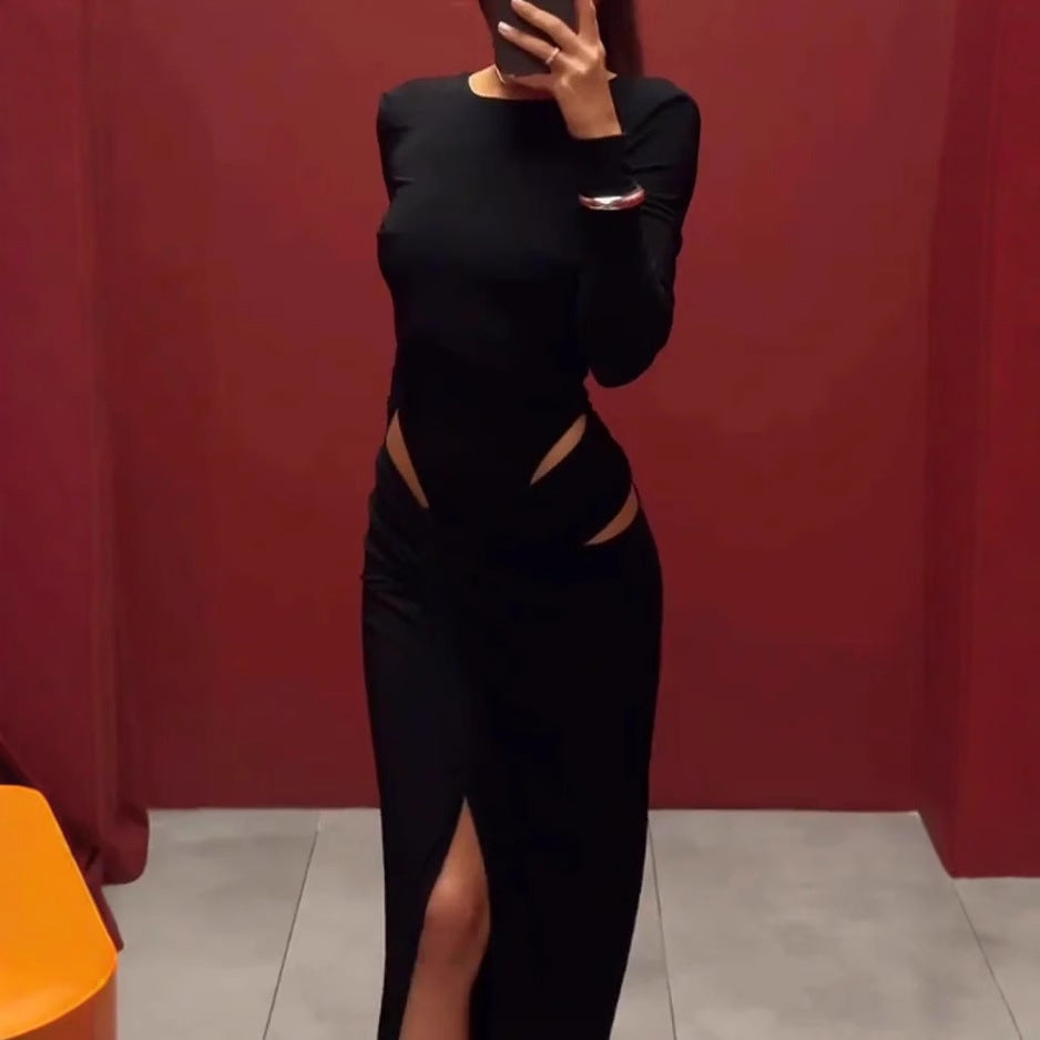 Fashionable Long Sleeve Hollow Cutout Solid Color Dress